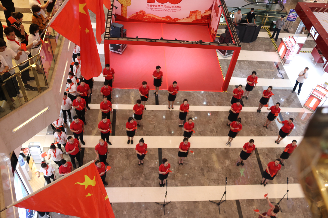 下午14時(shí),國(guó)芳集團(tuán)慶祝中國(guó)共產(chǎn)黨成立100周年紅歌快閃活動(dòng)在蘭州國(guó)芳百貨廣場(chǎng)店一樓中廳隆重舉行。國(guó)芳集團(tuán)全體黨員及員工代表參與其中,大家用歌聲表達(dá)對(duì)黨的無(wú)限忠誠(chéng)和美好祝福。