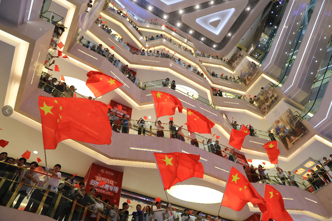 國(guó)芳百貨中廳,隨著鋼琴聲響起,活動(dòng)在男、女領(lǐng)唱“歌唱我們親愛(ài)的祖國(guó),從此走上繁榮富強(qiáng)”的歌聲中拉開(kāi)了活動(dòng)的序幕,30余名國(guó)芳集團(tuán)黨員及員工代表緩緩向主舞臺(tái)走來(lái),大家手持國(guó)旗,組合成“100”字樣,神采奕奕,高聲齊唱。與此同時(shí),現(xiàn)場(chǎng)的圍觀顧客也紛紛加入到隊(duì)伍當(dāng)中,為演出錦上添花。